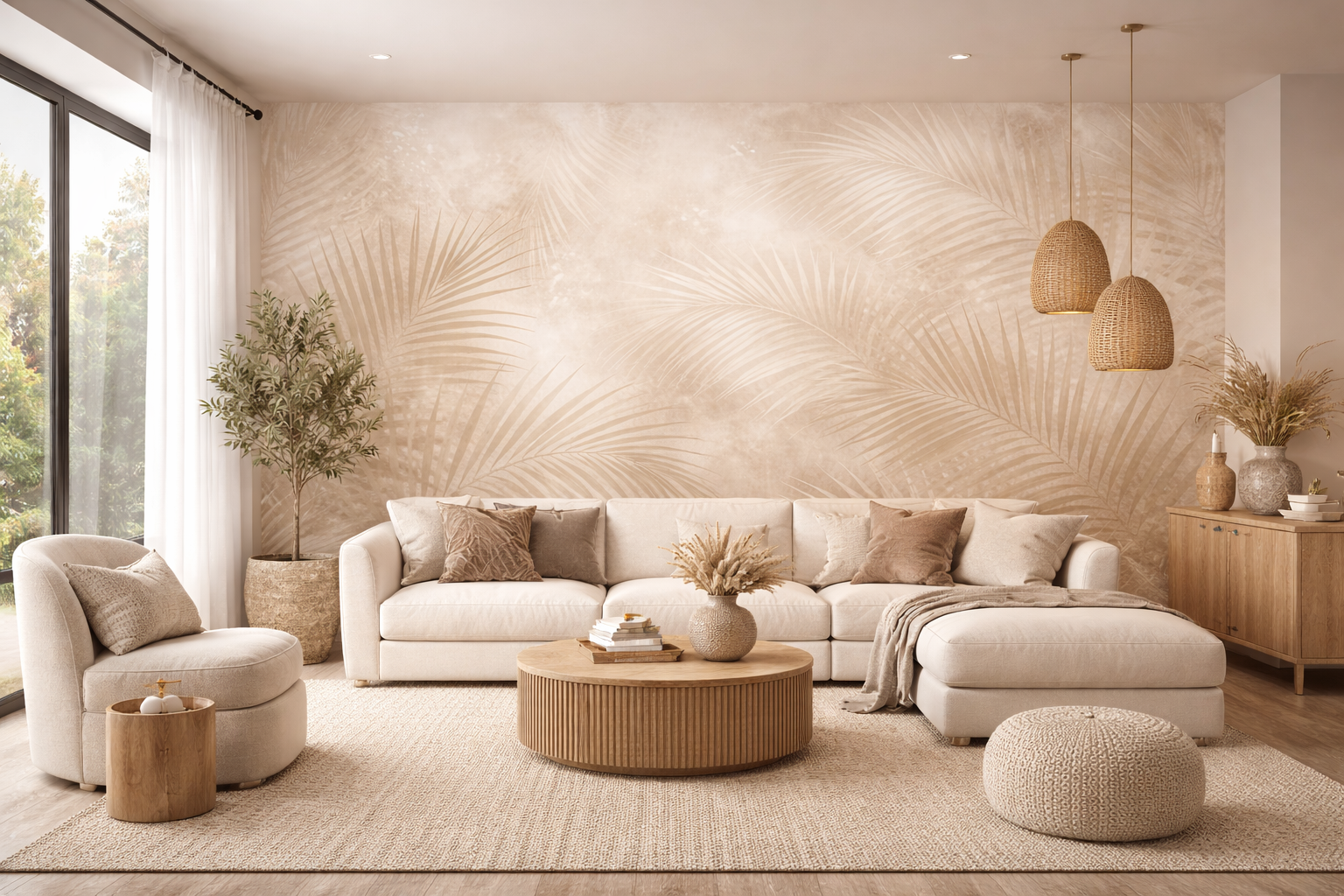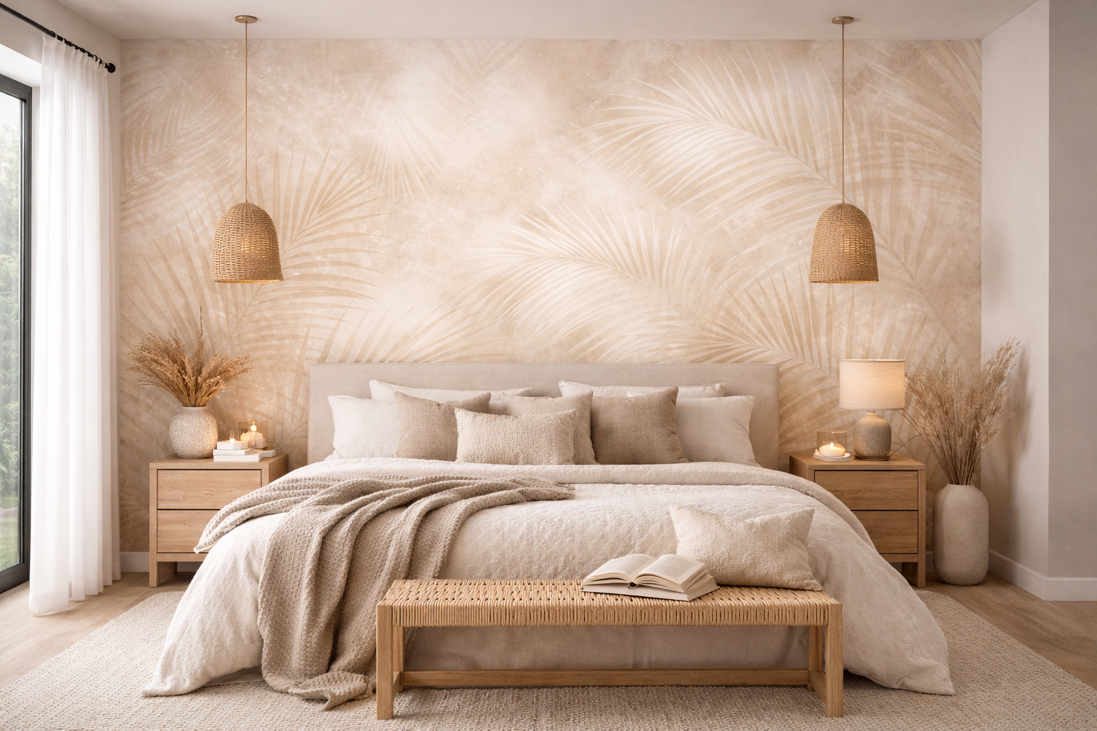 Stonowana kolorystyka oraz lekka, artystyczna forma sprawiają, że fototapeta doskonale wpisuje się w nowoczesne trendy aranżacyjne, takie jak boho, japandi, natural modern czy styl skandynawski. Motyw palmowych liści nadaje wnętrzu egzotycznej subtelności, jednocześnie pozostając eleganckim i uniwersalnym tłem dla mebli oraz dodatków.