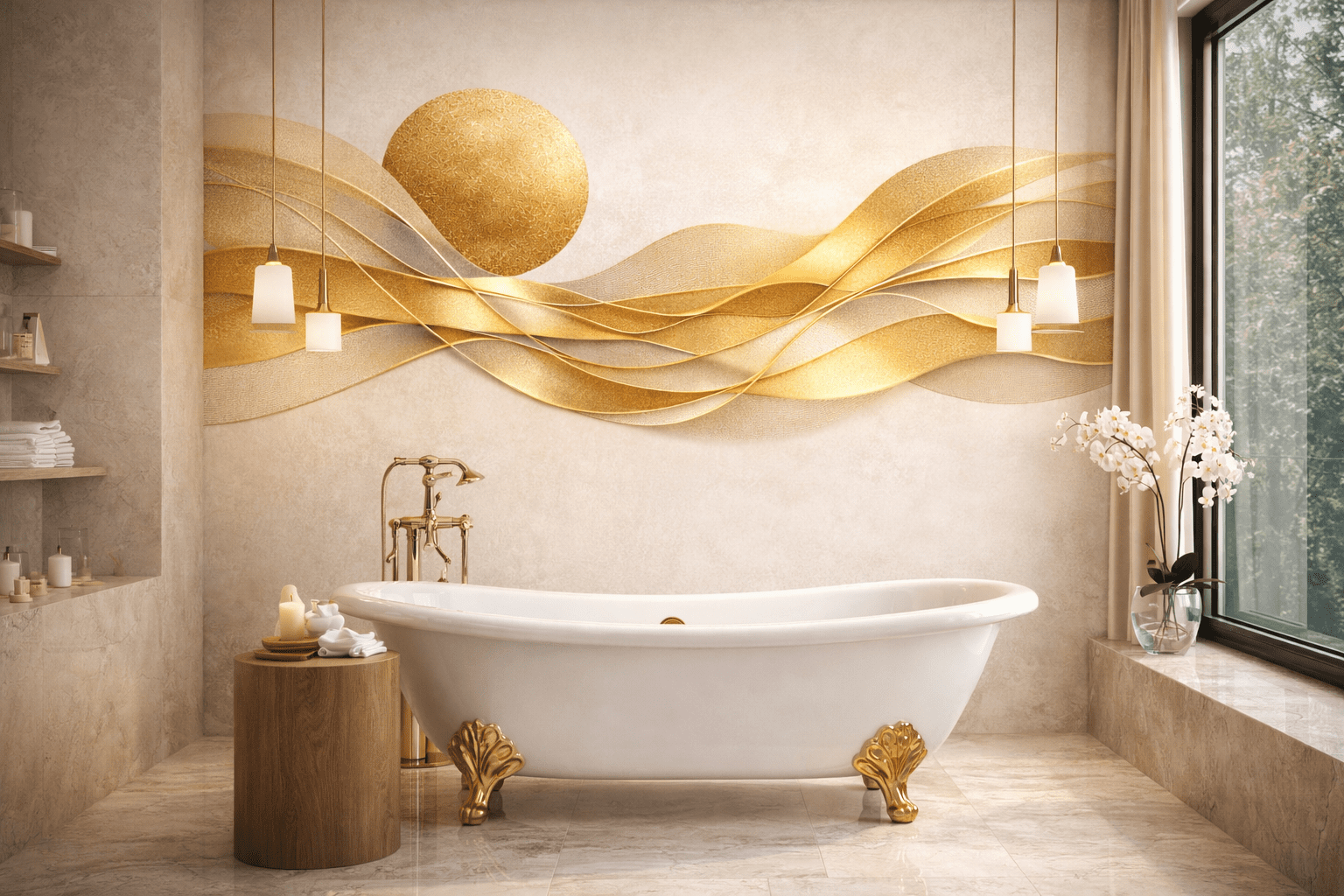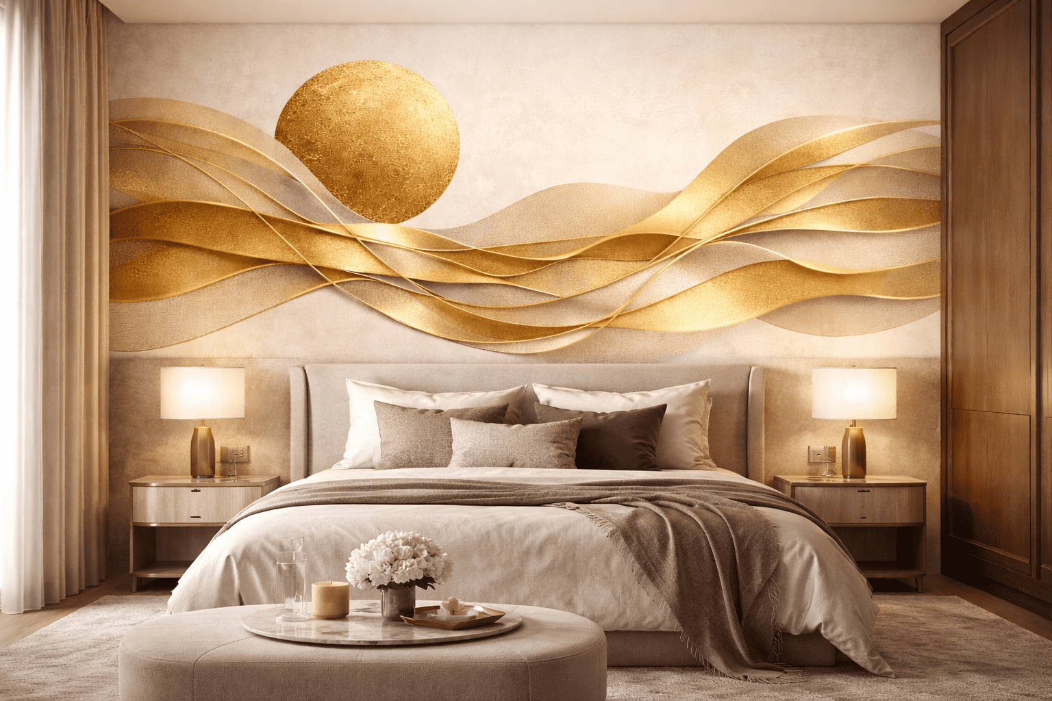Projekt inspirowany jest włoskim designem, w którym światło, subtelne przejścia tonalne i elegancka forma tworzą harmonijną kompozycję. Złote akcenty i przestrzenna struktura sprawiają, że ściana staje się centralnym punktem pomieszczenia.