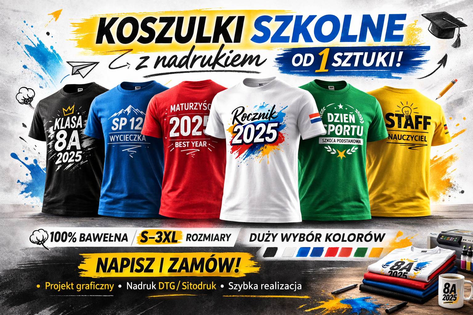 • druk DTG – polecany do krótkich serii i pełnokolorowych projektów,