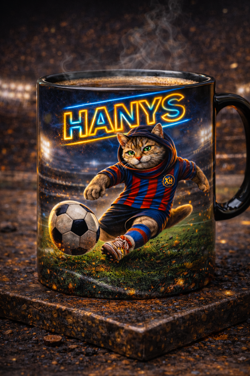 Kubek ceramiczny z grafiką Kot Hanys w industrialnym stylu Śląska.
