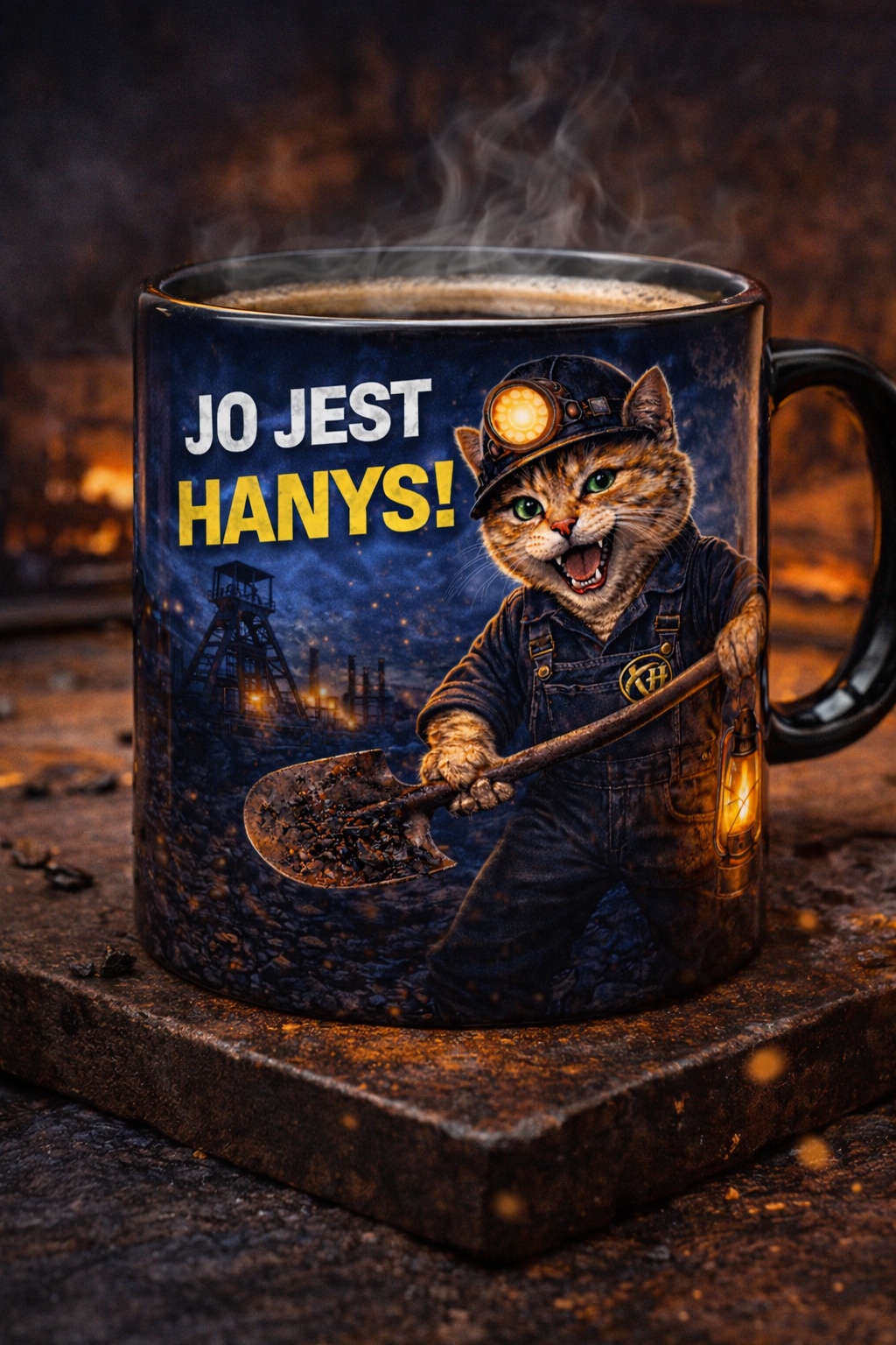 Kubek ceramiczny z grafiką Kot Hanys w industrialnym stylu Śląska.