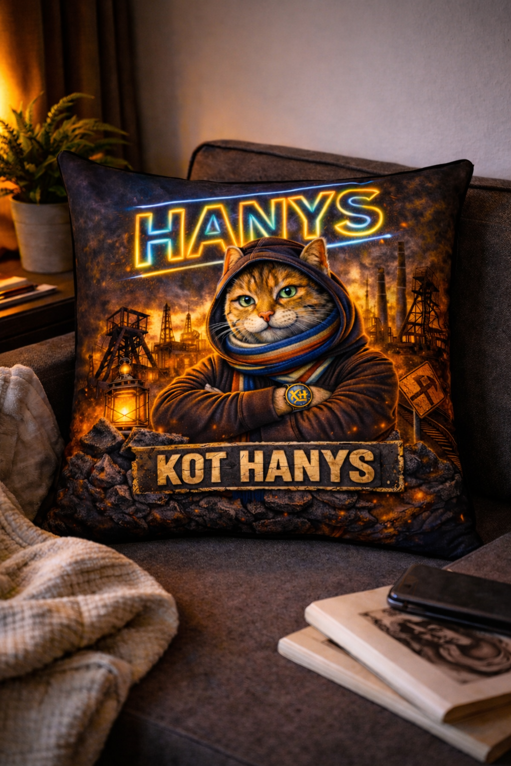 Poduszka Kot Hanys – śląski styl to dekoracyjna poduszka z grafiką inspirowaną industrialnym klimatem Śląska i kopalniami. Idealny prezent dla fana Kot Hanys.